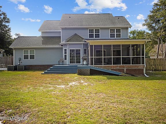 Welcome home to this charming, move-in ready 4 bedroom, 2.5 bath home with a large bonus room in the lovely, waterfront, gated community of Chadwick Shores. The community offers a waterfront park with a boat dock and is easy to enjoy kayaking, walk boarding, and canoeing just steps away from your new home. This home is big, beautiful, and features a welcoming foyer that leads into a large living room, kitchen with a breakfast area, dining room, and first floor primary bedroom. There is plenty of natural lighting throughout this home and the home has a covered screened in porch with a deck, which can be entered from the living room. The primary bedroom includes an ensuite with double vanities, walk-in shower, and a large walk-in closet. This home is a must see, conveniently located to the beach, ICW, shopping, restaurants, base, and is the home of your dreams.
