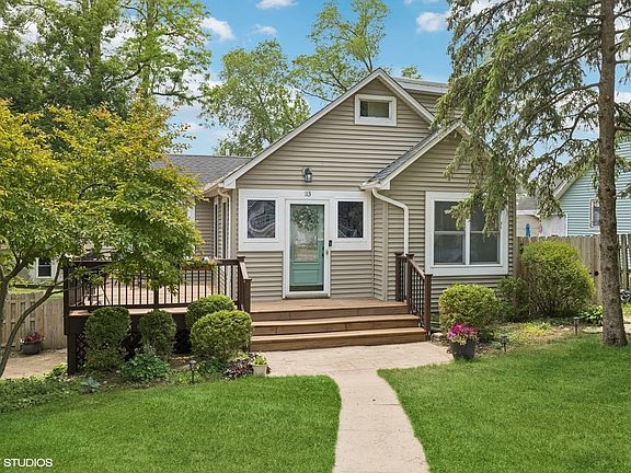 This adorable 2 bedroom, 2 bath Cape Cod style home can be yours - just in time for summer fun! Enjoy water rights to Island Lake and a convenient location close to the Fox River and Lake County nature preserves! Inviting, light filled layout with hardwood cherry floors throughout the first floor, beadboard ceilings, master suite with loft overlook and new wraparound front deck! Many updates throughout with newer furnace, water heater, doors, siding, windows and garage door. Brand new deck flooring and refaced kitchen cabinets! Great outdoor space with a large fenced yard and side lot included! Unfinished basement with 1 car garage access, currently used as a workshop with removeable dividing wall. Offered AS IS.