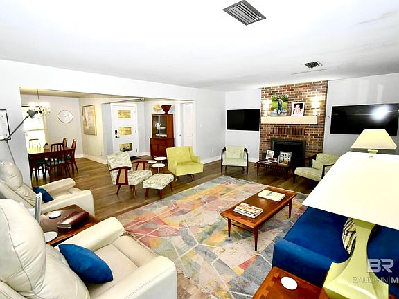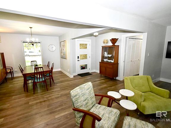 This mid-century modern home with curb appeal is a must see. Located on sought after Spring Drive. A walk or short golf cart ride to Downtown Fairhope. For first Friday Art Walks, festivals, parades, boutiques and restaurants. Large open concept living/dining area with woodburning brick fireplace. Stainless steel appliances with fantasy brown granite and coffee bar. Spacious 3 bedrooms, with 2 baths. Large windows the whole length of the sunroom off living room. This house offers nice storage areas. Large laundry room banked with cabinets and large quartz countertop. New windows and vinyl plank throughout. New air system and airducts. Insta tankless hot water heater. 2 car garage with vinyl plank. Storage shed. This well taken care of home is a true gem. Buyer to verify all information during due diligence.