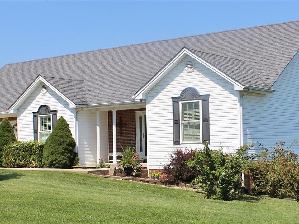 Charming Mercer County ranch home conveniently located right off Hwy 127, approx 5 miles from Harrodsburg and 7 miles to BG Parkway. Split-floorplan, single story living, total KU electric, over an acre of yard to enjoy! 3 Bedrooms, 2 full baths, open concept living room w/cathedral ceiling, hardwood flooring & gas log fireplace, kitchen features plenty of counter-space & bar, fully applianced, pantry & breakfast area. Primary bedroom suite features cathedral ceiling, large walk-in closet, bathroom features 2 vanities, soaking tub & walk-in shower. Formal dining room, laundry room w/washer & dryer included. Spacious 2 car garage has a pull-down stairs for attic access/ample storage. Underneath the home, there's plenty of storage & hobby space, overhead lighting & electric outlets. This home is a must-see & fast!!!