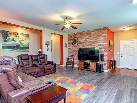***Eligible for 100% USDA financing.*** Wonderful move-in-ready 3 bed 2 bath home on one level zoned District 2 Schools. Featuring 9 ft ceilings throughout and wood laminate floors in the Great Room and into the Kitchen area. Notice the elegant accent wall and gas fireplace in the Great Room. Continue to the kitchen which features a 5-burner Convection gas stove/oven, Convection microwave, dishwasher, Corian counters, tile backsplash, island with breakfast bar seating, and pantry closet. Step out for your morning coffee and enjoy an oversized patio with a huge awning for shade along with a spacious lot and tree lined backyard. The Master bedroom includes a sitting area, bay windows, and a large walk-in closet. The Master bathroom features double sinks, a garden tub and a separate shower. The additional two bedrooms have ceiling fans and the second full bath has laminate floors, a single sink with a makeup counter and a shower/tub. Additional features: gas/electric oven and dryer hookups, garage opener with battery backup, new insulated garage door, shed. View 3D Virtual Tour! Write your offer today!