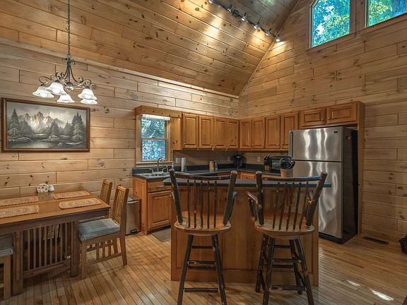 Perfect mountain getaway! Turn key, ready to go into a rental program or be your private getaway. Beautiful cabin perched on the hillside overlooking quaint slow moving Sugar Creek & only minutes to downtown Blue Ridge, GA! Spacious, open floor plan with large rooms throughout. Massive floor to ceiling fireplace in the great room! Master on main with bunk room upstairs for kids. Game room and guest bedroom in the walkout basement. Large covered porches as well as newly extended deck space with a fire pit for those cool fall and winter evenings. "Treehouse" off side of porch houses the hot tub. Immaculately kept north Georgia cabin at a great price!