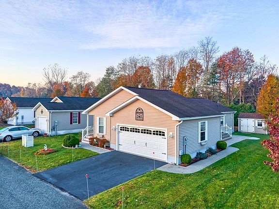 IS THIS REALLY A MOBILE HOME? This is what you will be asking yourself when you see this amazing, well-built Martlett Peachtree home, located in the desirable Sunrise Ridge Estates 55+ Adult Community. Through the front door you will enter the foyer, which leads to the living room with a beautiful stone gas fireplace and connects to the formal dining room. The spacious, eat-in kitchen features an island, ample cabinets and interior access to the RARELY available 2 CAR GARAGE so you are protected from the elements when you get home. Slider from the kitchen leads out to a deck so you can oversee your perfect sized yard with a shed for additional storage. There are 2 spacious bedrooms and 2 full baths. The master bedroom features its own en-suite bathroom with a shower, as well as a jetted soaking tub. This low maintenance and affordable home could be the perfect home to retire to. Don't miss out on this rare opportunity!