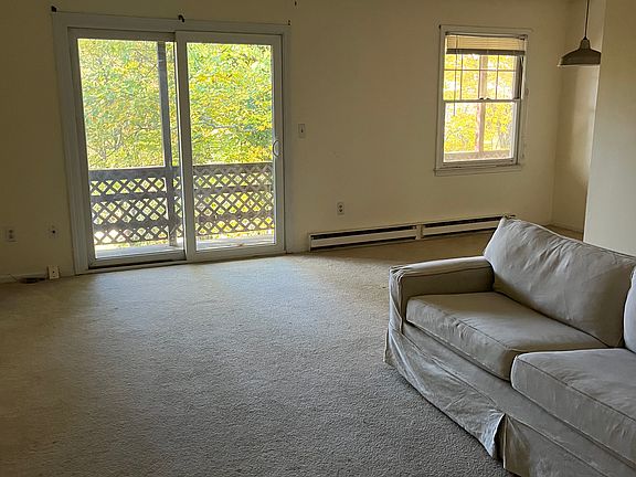 Second floor end unit, large windows bring in plenty of light, with a spacious and private back deck. Adjacent to Deep River land trust property. This unit is on a quiet residential street and convenient walking distance to town, super market, restaurants, library, elementary school and more. 1 mile to route 9. Plenty of closet space, professionally re-glazed bathtub, updated fixtures, brand new hot water heater, the carpets have been professionally cleaned. Coin operated laundry is located in the building. No smoking. No cats. One small dog possible. Water, garbage and snow removal included. Electric heat and cable are not included. Background check and references required. First, last and one month security.