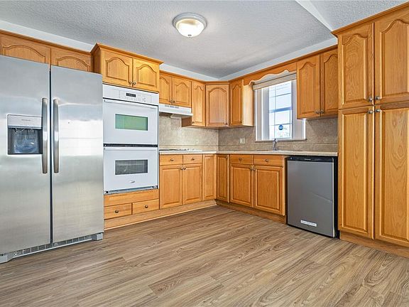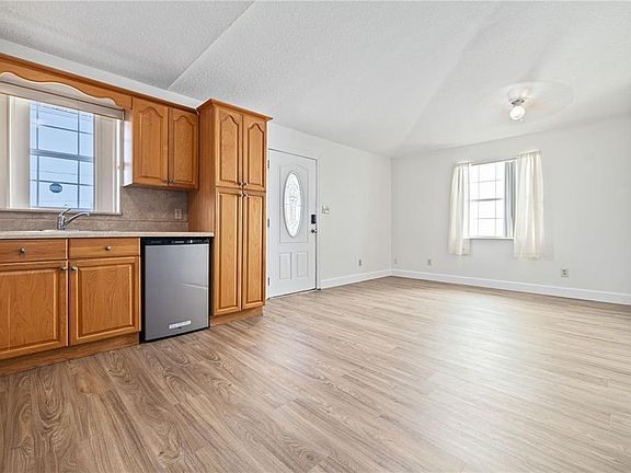 Abundance of natural lightOpen concept designVinyl flooringWood kitchen cabinets