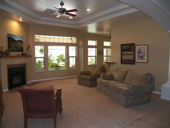 Welcome home to this incredible split floor plan! Landscaped front yard has pathway to covered porch & entry. Tiled entry floors flow down the hallways into the kitchen, laundry & baths. Office has built-ins & wood floors. Front dining has tile floors and living room offers lush carpeting. White pillars accent wide opening into the custom painted living rm; tray ceiling w/lighted fan;corner fireplace w/mantle & tile surround. Breakfast nook opens to kitchen & living rm with French door to patio. Spacious kitchen offers recessed lighting; granite counters;pantry & decorative accent cupboards;gas cooktop w/pasta faucet, convection & conventional ovens, wine cooler, dishwasher & refrigerator. Indoor laundry offers storage & garage access. Powder room. West wing houses huge master suite; tray ceilings w/lighted fan;bay windows;dual sided gas log fireplace;spa like attached bath w/garden tub; oversized shower;vanity 2 sinks;walk-in closet & private toilet.Two guest rooms & full bath East wing. Large covered patio w/fireplace & 2 fans. Entire rear yard is landscaped and features a pond. West side covered patio area off the master. 8' x 14' storage shed and boat gate & parking on side