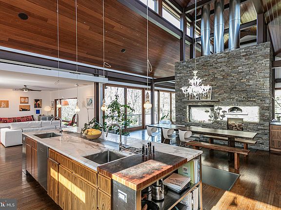 Leave all expectations behind when you come to this imaginatively designed modern home discreetly nestled into Princeton’s Western Section. What appears to be a cozy mahogany-clad house tucked behind stone garden walls is revealed to be a dramatic 2-story modern barn with soaring wood ceilings, expansive windows and a massive 2-sided stone fireplace defining an otherwise wide-open floor plan. The grounds, too, offer so much more than initially meets the eye with a stone terrace with integrated spa overlooking a rolling lawn dotted with impressive trees and a heated gunite pool. The elite team of Lucash Montgomery and A+B Design Lab are responsible for the concept and build of the barn-like structure as well as transforming the pre-existing mid-century home to blend with the new construction. The result is an extraordinary design that lends itself to both intimate nightly dinners and grand-scale entertaining. The kitchen functions like a Michelin-star restaurant with a workhorse Wolf range, full-size Sub-Zeros and an ingeniously designed marble-topped island with a multi-functional trough running down the middle. While there are far too many custom details to list, a translucent floor panel is especially intriguing, a hint that the walk-out lower level is not to be overlooked. This includes a bedroom wing with three large rooms sharing two large bathrooms. Of course, downstairs is where you’ll also find the wine cellar, as well as a family room with yet another fireplace flanked by bookshelves and brightened by more large windows. There's also a versatile gym with a kitchenette and ample access for outdoor entertaining on the spacious bluestone patio. A guest suite is nicely separated, along with an art/craft studio which could accommodate a number of desired functions including a potential sixth bedroom. Custom closets and an additional dedicated laundry room are more conveniences that show this level was thoroughly thought-out. The sun-filled primary suite is situated on its own main floor wing including an ensuite Scandinavian-style bath with a steam shower, frosted glass doors and a wood-wrapped tub as the serene centerpiece. Also nearby is a second laundry room. This stunning property, within a mile of downtown and Princeton University, epitomizes low-key luxury and is like no other in Princeton.