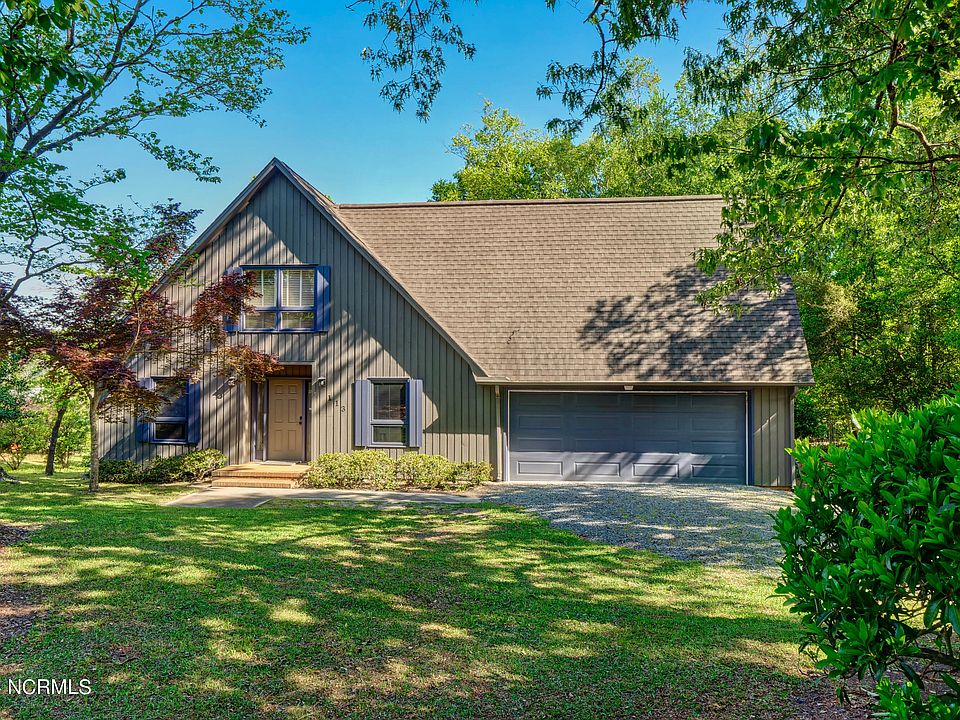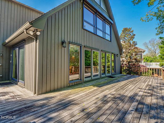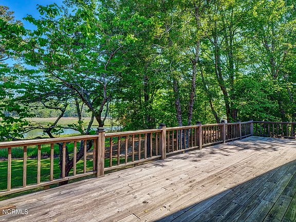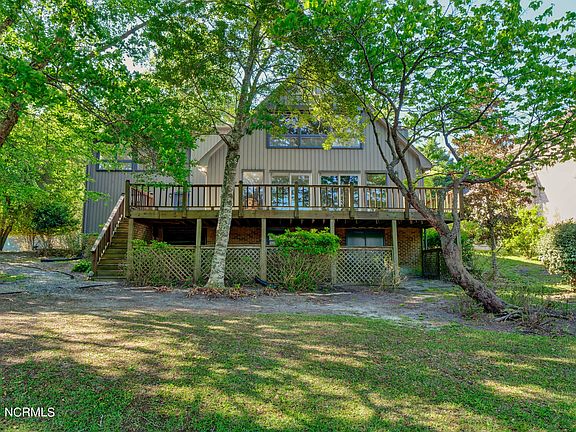 Live the waterfront Carolina dream with your boat out your back door at your own private dock! The home is perched on a .71 acre bluff overlooking a pristine saltwater creek, safely outside the flood hazard zone and on a quiet cul de sac. The ICW & ocean & inlet are nearby with miles of sandy beaches! The dock is on a dredged creek navigable at all tides & features a 53' floating dock, water and 30 amp power. Inherently inviting, the 3BR 3BA rustic contemporary combines traditional charm with a modern open plan design perfect for entertaining big. Warmed by a stacked stone gas logs fireplace, the greatroom also features a cathedral ceiling of knotty pine & dual gliding doors overlooking the tranquil waterviews. The kitchen boasts a center island with gas range, cherry cabinets with soft close drawers, pot drawers, new side by side stainless refrigerator, pantry, breakfast bar & extra deep double sink. A built in corner cabinet enhances the dining area that also has gliding doors to the wraparound deck. Completing the downstairs is a bedroom with full bath, entry foyer & large laundry room with built in cabinetry, utility sink and washer & dryer. Upstairs is accessed by a lovely nautical spiral stairway with wood treads. There you will find an expansive master suite with adjacent office, dressing area, walk in closet & private bath. The balcony overlook from both allows the knotty pine to be a focus from up and down! There is also a 3rd bedroom with full bath, pocket door, walk in closet and eave storage. Speaking of storage, the 26x13 walk out basement with utility sink can be a man-cave or she-cave in waiting! Additional features include a 2-car garage with pedestrian door, landscape with lighted walking path to the water, gorgeous live oak, dogwood & Japanese Maple. The roof is newer and 1 heat pump is new. Add in the optional 18-hole golf course, pool, tennis and the deeded deep water boat ramp on the ICW and you have the ultimate forever home!