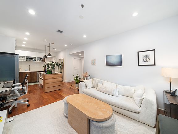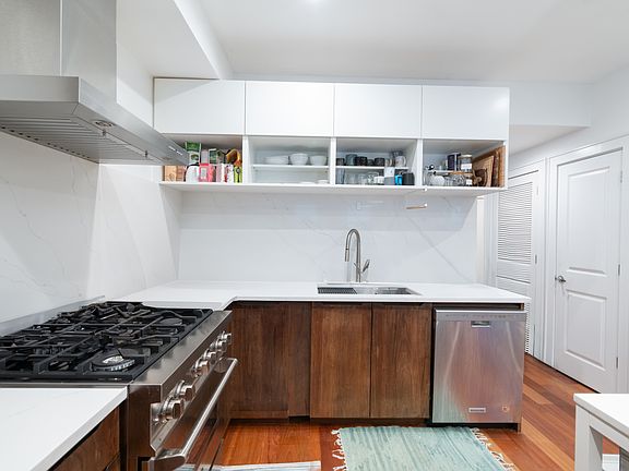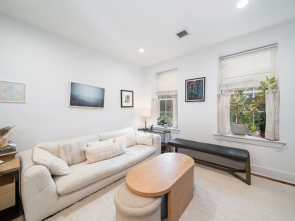 Enjoy a designer chef's kitchen featuring stainless steel appliances, quartz countertops and backsplash with new and modern cabinetry. The open layout is enhanced by hardwood floors, custom lighting, oversized windows, and central A/C.