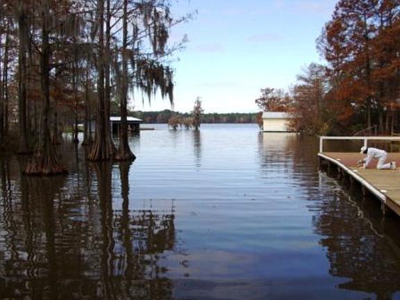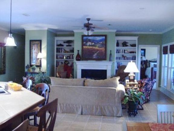 From the moment you enter the double beveled glass front doors of this home you are sold on it's location! Huge open areas for the Living/Dining/Kitchen which open out onto a large screened porch. Cherry custom cabinets with tiled countertops and jenn air stove in a large island with plenty of seating.Tiled floors in the living areas, baths,and kitchen with carpet in the 3 bedrooms.Large master bedroom with huge walk in closet and spacious bath which includes a jacuzzi tub and separate shower as well as double vanity.2 more bedrooms are located on the front of the house with guest bath and laundry room.Spacious screened porch opens onto a deck with gorgeous views of the main lake and sunsets.Boat house with large dock. Detached garage which has been converted into play room and bunk house