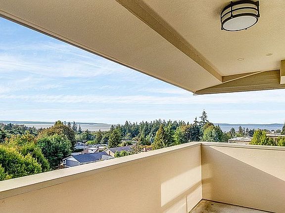 Beautifully maintained top floor corner unit (elevator) in updated Seavue Building. Lovely entry opens to grand living area overlooking Sound/Mountain views with cozy WB fireplace. Formal Dining, sliders to open air patio overlook park setting with stunning Edmonds to Mukilteo water views. U shaped kitchen w/ pop out garden window and breakfast nook. Spacious hall leads to bountiful storage/full size utility room w/ W/D. Main bath with 2nd bedroom. Private master with ensuite. One garage space/storage. Freshly remodeled building. Great HOA board. Dues include reserve funding. Cat ok.