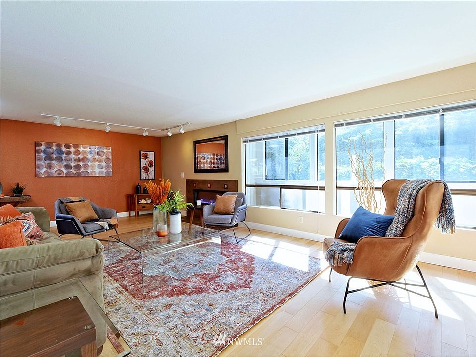 Beautiful condo in Edmonds Bowl just blocks to shopping, restaurants, beach, Farmer's Market, parks, ferry. Large 1,397 asf 2 bedroom , 2 bath condo has plenty of kitchen space with like-new appliances and eating area. Space currently used for office could serve for formal dining. Gorgeous new Maple hardwood floors throughout, new tile floors in bathrooms and utility room, new LED fireplace. Utility room with full size washer and dryer. Lots of storage space. Community common room, HD cable (100+ channels) and Wifi included in the dues. Secured entry and elevator. Building is in excellent condition and HOA is well managed. This condo has a fabulous floor plan and amazing space. Enclosed deck being restored to original open air deck.