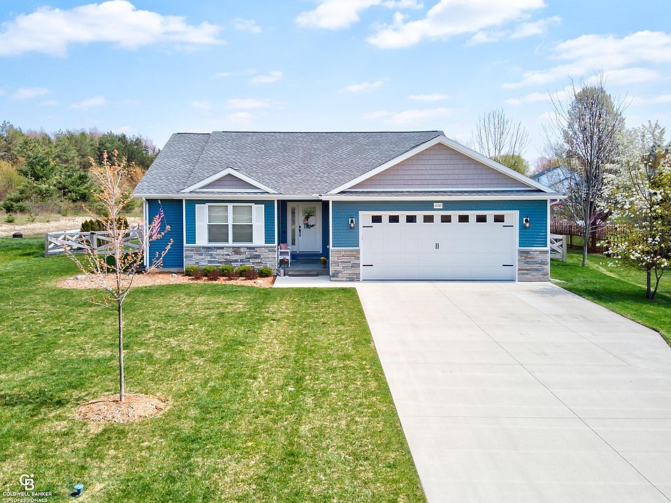 Gorgeous Ranch home built in 2020! Get all the new construction perks with all the extra ammenties added! This pristine home boasts 1425 sq ft, 3 bedroom and 2 full bath on a .35 acre lot that backs up to a pond! Enter through a large foyer with ceramic tile into an open concept layout. Living room offers cathedral ceilings, Kitchen has granite and bath has quartz counter tops and soft close cabinets. Kitchen comes with large island accompanied by seating space and has eat in dining iwth door wall over looking gracious fenced in backyard on a pond. Sit out on your covered back porch and enjoy the wildlife. Primary bedroom suite also has views of pond and is joined by a full bath with ceramic tile floor and tile shower inlcudes interior walk in closet. The large drywalled 2 car attached garage is spacious enough for your truck and storage also with ladder up to attic storage space. Come move in and right away enjoy a newer construction home with out the extra expenses of the grass, fence, driveway with extra parking space, landscaping, porch & back deck and appliances already included! This one is a must see and we hope to welcome you home!