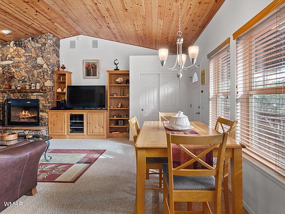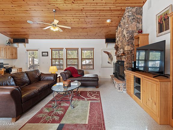 Escape to the cool White Mountains: fully furnished retreat with 2-car garage and scenic setting. Nestled among tall trees, this enchanting 3 BR, 2 BA cabin beckons with its tranquil setting and inviting amenities. Step inside to discover a spacious open floor plan, ideal for cozy evenings by the fireplace. Enjoy the crisp mountain air from the comfort of your front or rear covered decks, perfect for savoring morning coffee or stargazing under the night sky. With a fenced yard and ample parking - 2-car garage plus addl. off-road parking area. Check out the large storage space under the house with easy access under back deck. Affordable HOA fee is just $190 annually. There are short-term rental limitations. Don't miss your chance to own this idyllic mountain escape.