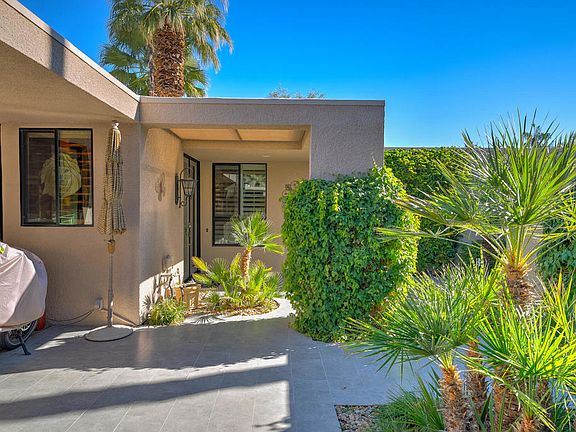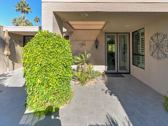 Great opportunity to acquire one of only three stand-alone homes in the entire Canyon South-3 condos. Located in South PS, this beautiful 3 BDR (3rd is a Den) home boasts breathtaking views and offers an unparalleled desert lifestyle. Be captivated by soaring ceilings & natural light that fills every room. The open floor plan seamlessly connects the living, dining, kitchen & bar areas, creating the perfect space for entertaining. Updated kitchen is a chef's delight, featuring modern design, ample counter & storage space, and breakfast bar. Enjoy panoramic views of the stunning mountains by the South West facing patio. The spacious primary BDR has double closets and is complete with a large sliding door that frames beautiful vistas of one of the community pools & spas. The ensuite bathroom offers a luxurious retreat with walk-in shower, modern tile work, dual-vanity and tub. BDR2 features also a walk-in closet, en-suite bathroom and a direct access to the private patio. Take advantage of the outdoor space with patios on 3 sides with views of the expansive grounds, perfect for enjoying your morning coffee or hosting al fresco dinners. A sparkling pool is just steps away. Offering privacy while still being a short drive from all the amenities you need. Some of the expensive upgrades: 2019, 25-Panels Owned solar system for ''zero-bills'', 2016 double pane windows & doors, AC in the garage with Epoxy floor, custom cabinetry & desk, sound system throughout and new roof coating.