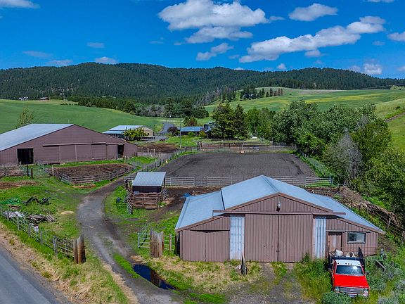 Nearly 4,000SF of house, & a 10,000 SF indoor riding arena, 3 bay shop, barn & outdoor riding facility, with 8.19 +/- acres on a paved road just out of Moscow! Nestled at the base of Moscow Mountain, this property is every equestrian lovers dream. The arena has 2 heated tack rooms, arena viewing room, and 7 runs. Most of the home is one-level living and lots of options for friends and family to stay. With a country kitchen, spacious living room, a formal dinings & den with fireplace. The upstairs master is updated with tile floors, extra long deep soaking tub, spacious dual-vanity & a huge walk-in closet. Next to the home is a game/hot tub building. Step outside onto the patio & you hear the babbling of Idlers Rest Creek by the garden and orchard. The 32' X 56' heated shop has plenty of room for projects and equipment. There is also an additional 2,300 SF barn for hay & more animals. The 30 acres has additional access to Schultz Rd and can accommodate an additional two separate homesites per Latah County!