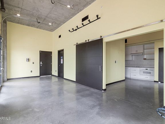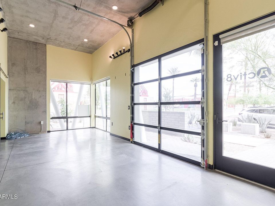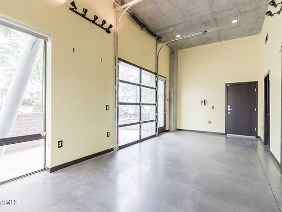 Modern condo in excellent Downtown location! Unit 105 is a rare Live/Work unit, excellent for a home-based business. This is the only unit like it: ground-floor corner unit with NE elevation, views of park, a glass garage door that opens to landscaping, patio area, AND exposed concrete floors, walls & 13' high ceilings. Benefits of living at en Hance Park are 10'8'' or higher ceiling heights, walkable, bikable, pet friendly, newer construction, clean modern design, entry garden with fountain & light well, heated pool, covered parking, secured entry gates and driveway gates. Live across Hance Park, Burton Barr Library, 2 blocks from Roosevelt Row, Light Rail, yoga, dining, events & more. Two covered parking spaces included in sale! Community amenities include: entry garden with fountain and light well; secured access with gated entry and gated driveways; modern heated pool with sun deck and loungers; gas BBQ and fire pit with outdoor seating; secure community bike rack; covered parking; elevator to all floors; and desert landscaping. HOA includes water, sewer, trash and recycling.
