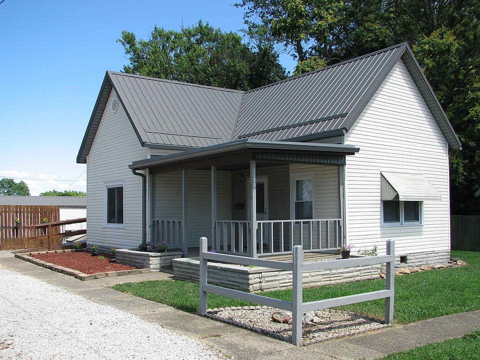 Wonderful 3 bedroom home w/COVERED FRONT PORCH, partial basement, storm cellar, detached garage & COMPLETE FENCED YARD all on large over sized CORNER LOT! FRESH NEUTRAL colors invite you inside! Custom touches are present throughout home including living room tray ceiling, electric fireplace w/brick mantel, recessed lights, dual closets separated by recessed area in primary bedroom suite for TV or dresser, kitchen with huge eat-in breakfast area+walk-in shelved closet in third bedroom could be used as additional pantry. Interior also has 4 ceiling fans, mini-blinds throughout, smoke detectors & carbon monoxide detector. Plus, recent improvements include $20,000 METAL ROOF W/INSULATING NOISE REDUCER, SNOW GUARDS & FULL GUTTERS/2019 W/LIFETIME TRANSFERABLE WARRANTY, HIGH EFFICIENCY GAS FURNACE & 16 SEER HVAC W/OUTSIDE CENTRAL AIR CONDITIONER/2015, disposal/2018, 200 amp electric service/2014. There is vinyl siding w/insulation/2005, water heater/2011 with manufacturer date 2009, replacement windows/1996 & updated metal exterior doors per prior owners from recorded info from prior MLS. Rock additional street parking & driveway all make this an especially pleasing home! MUST SEE!