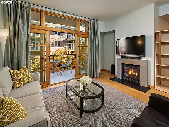 Coveted Courtyard Studio at the Bridgeport! Wall of windows provides great natural light. Quiet interior unit, hardwood floors, gas fireplace, built-ins. Washer and dryer in-unit. Parking space and storage. Sweet balcony overlooking courtyard foliage and right in the middle of it all in the Pearl!