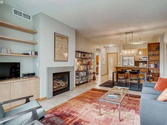 Contemporary Bridgeport Condo located adjacent to Tanner Springs Park and on Streetcar line. Really well designed floor plan, with great light and new bamboo floors, built-ins, gas fireplace and large bay windows for great city views. Master bedroom is updated with built-in desk for work at home needs, newer cabinets and carpet. Kitchen includes stainless appliances, large pantry and enough space for both a dining table and eat in bar. Includes parking & storage. Freshly painted great condition!