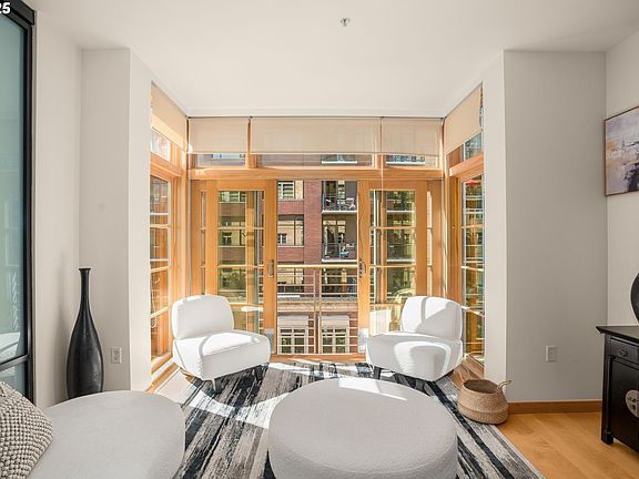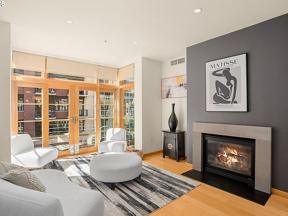 Light-filled One-Bedroom + Den at Bridgeport Condominiums. Elevated above the urban setting, this residence offers soaring ceilings and a thoughtfully designed floor plan optimized for flow. Refined upgrades include maple hardwood floors, recessed lighting and a suite of new stainless steel appliances—refrigerator, gas range, and washer/dryer. The enclosed den, framed by a sleek barn door, flexes easily between a private office or guest retreat. The main living area is anchored by a cozy gas fireplace and complemented by a Juliet balcony with French doors. A generous dining area comfortably accommodates a large table, perfect for gatherings. The tranquil primary bedroom offers privacy and a spacious walk-in closet with a custom organizer system. Added conveniences include a deeded parking space and a storage unit. Located in the heart of the North Pearl, Bridgeport residents enjoy proximity to Tanner Springs Park and The Fields Park, with shops, groceries, theaters, live music and great dining. The Portland Streetcar runs adjacent, connecting you seamlessly to the city.