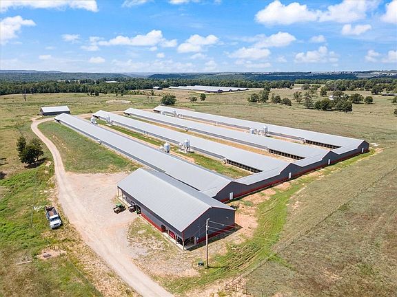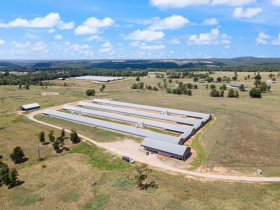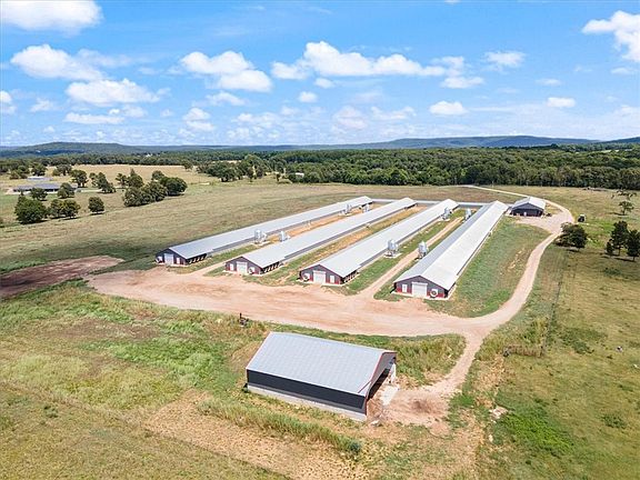 This is a very attractive, almost brand new productive poultry/cattle farm (no cattle on property at the moment but fenced & cross fenced with steel corners and good gates for livestock).For cattle, there is well water and ponds.There are 8 working breeder hen houses-4 "Angry Birds" farm and 4 "Happy Hens" farm.Excellent contract with Simmons (see info in attachments).This new poultry facility incl 2 units of 4 - 40'x615' hen houses/equipt/bi color metal, w/ a 15' x 318' connecting walkway & a 50' x 115' egg room, work room,generator shed,& water storage shed.Each facility has a break room,laundry room,& full bathroom.Equip/house incl but not limited to 65 cool cell pads/side, 10 - 54" tunnel fans, 3-36" exhaust fans, bi-fold end doors, 50 stage Rotem Diversified controller (Munters),curtain sides except for about 20" solid sidewall at the bottom,chain feeders lubing waterers, 2-12 ft feed bin and 2-2.5weigh bins/house, plastic slats,Hog Slat/Lubing conveying & egg gathering system w split unit egg rm coolers.