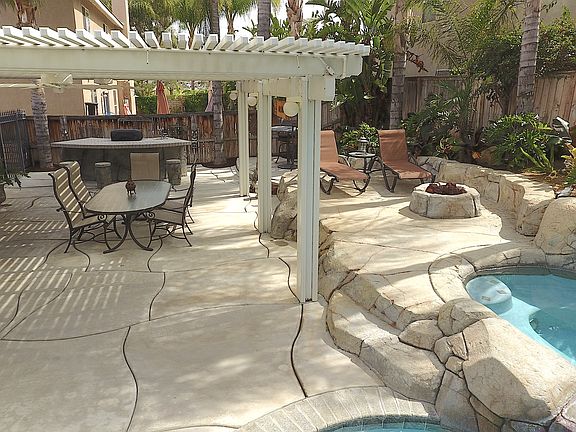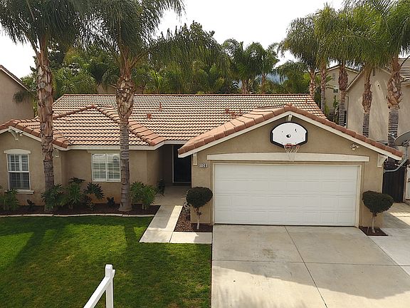 Tropical Paradise!! Must see this 4 bedroom 2 bath single story home located in a great school district. Open concept kitchen and living area. Kitchen has new stainless steel appliances. Custom paint and upgraded oversized tile floors customize this home. Plantation shutters are thruout the house. Patio doors flow off the kitchen and master retreat to the vacation like backyard. For the entertainer, there is surround sound thru out the home and backyard. The patio cover is made of alumawood for long lasting beauty. The salt water pool and spa has four amazing waterfalls! Built in BBQ and gas fire pit complete the backyard. There are over 20 Palm trees that are dotted around the property. You can also park your RV or motorhome on your own property. There is 60 feet of RV space. Must see property! Homes with this many features don't last long.