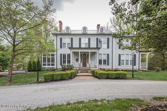 Nestled within the acclaimed Anchorage School District, a thoughtfully restored residence is a testament to Anchorage's heritage. According to Samuel W. Thomas' book ''The Village of Anchorage'', the homestead that was built in 1879 started as a two-story, three-bay frame house with a hipped roof. Later, in 1929, it was expanded with a third-floor addition based on plans by Nevin & Morgan. Today, this Anchorage Historic Preservation landmark known as the Bedinger House welcomes you with wrought iron gates and stone columns. Within a serene 1.23 acre lot, framed by mature trees and landscaping, stands a home embodying true Anchorage architectural character. Inside, you'll find a haven of understated elegance and comfort, where seven fireplaces, pocket doors, built-ins, nooks, alcoves, balconies, and antique fixtures adorn every room. Spacious formal and informal rooms, a banquet-sized dining room, great ceiling heights and windows give a perfect setting for any type of activity or gathering. A screened in porch with tall ceilings and four sets of French doors that open into the main living spaces invites you to unwind amidst nature's beauty and offers a seamless transition to indoor-outdoor living. Relish the renovated kitchen's warmth, featuring a new center island with soft close drawers, and two built-in but hidden spice racks, a brand-new gas cooktop and a meticulously restored rail car flooring Butcherblock counter by Southern Vintage Louisville reclaimed wood. A wall of windows in the breakfast area overlooks the tranquil wooded lot and inviting pool. A primary suite with kitchenette and private access to the sideyard completes the first floor. On the second level, four bedrooms, including another cozy primary suite and private office, await. The third level of the home offers more bedrooms and a great landing, perfect for a reading area. Outside, a charming pool, outdoor kitchen, and 1/4 basketball court offer delightful entertainment options. With geothermal HVAC, spray foam insulation, and the convenience of an oversized three-car garage, partial finished and unfinished basement, comfort and space are assured year-round. A blend of historic charm and modern amenities, this thoroughly restored 6,600+ sq ft home stands as a beacon to Anchorage's history.