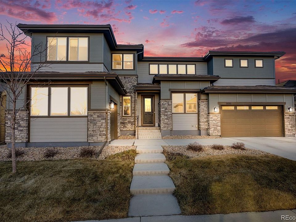 Welcome to 11303 Tango Lane, an exceptional residence nestled in the vibrant Stepping Stone neighborhood. This stunning home features an expansive floor plan, offering 5,412 square feet of meticulously crafted living space, designed for both entertainment and comfort. From the moment you enter, the foyer greets you with vaulted ceilings and elegant laminate flooring extending throughout most of the main level. The open layout is bathed in natural light, seamlessly linking the gourmet kitchen to the expansive great room. Highlights include an oversized quartz island, premium stainless steel appliances with double dishwashers and a dual oven setup, a walk-in pantry, and a butler's pantry with a wet bar sink. A custom light fixture enhances the dining area, adding to the home's allure. The family room features dramatic 22-foot vaulted ceilings, adorned with a custom fireplace and striking floor-to-ceiling stone tile work. The main floor also includes a private office with glass French doors, a formal living or dining space, a guest bedroom with an ensuite bathroom for added privacy, a powder room, and two mudrooms adjacent to each garage entry.