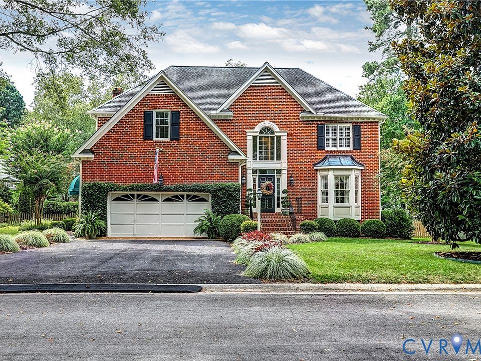 Stone fireplaceBrick front colonial homeProfessionally landscaped rear yardQuartz countersLower level patioHeavy moldingsCustom hardwoods