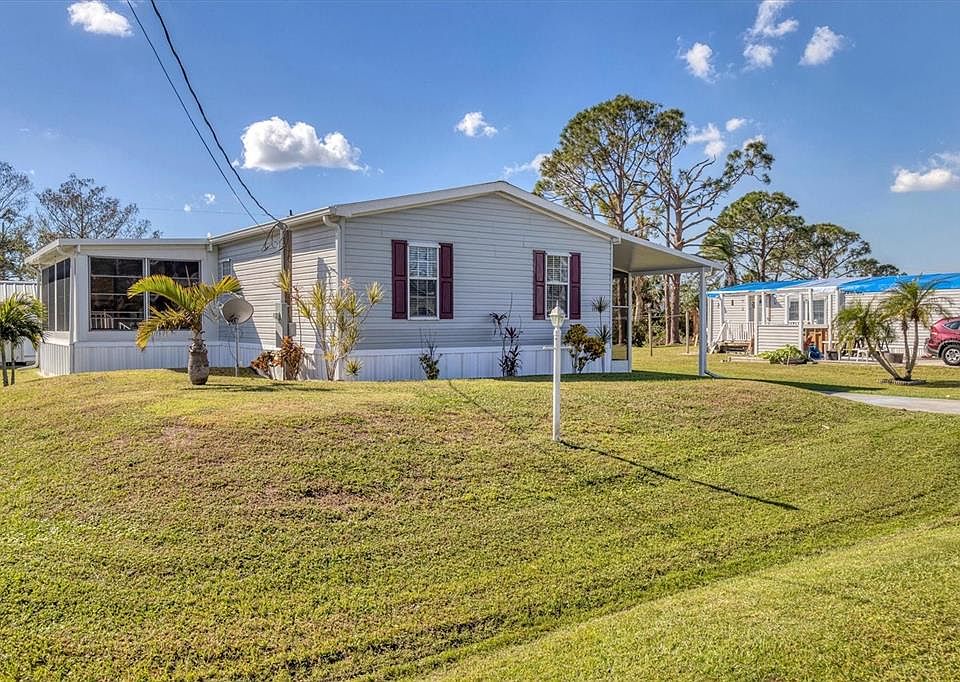 Back on the market, buyers' mortgage fell through! MOTIVATED SELLER! NEW PRICE! Come see this recently built 2005, 3 bedroom, 2 bath WATERFRONT home with a large 12x60 SCREENED LANAI 2010 AND Additional 20x10 FLORIDA ROOM with vinyl windows! Well maintained and updated ROOF 2016, SEPTIC 2010, DOCK 2019, AC 2017, WATER HEATER 2020. The land is owned here so NO lot rent. Open split floor plan, large rooms and a beautiful kitchen with a big breakfast bar and plenty of counters for work space and wood cabinets with crown for storage. There is a window over the sink and 8x6 dining area adjacent; all under a cathedral ceiling that opens up to the living room. Crown moulding in all the rooms is a plus. Roomy master with good sized walk in closet and private bath. The Master bath has a shower with two benches and guest bath is a tub/shower combo with grab bars to easily get in and out. Walk in closets in all bedrooms and ceiling fans with light attachments throughout. Inside laundry room with more wood cabinets and extra shelving. This home is on a pond that is connected to the other waterways by culverts so you can fish off the 3 year old dock (filled with fish including bass, tilapia and bream) and watch the wildlife including wading birds, ducks. Front and back yard pole lights on dusk to dawn timer. The one in the back is next to the dock and has electric outlets. Two sheds-one has the water equipment (softener, filter) with a roll-up door and the 2nd one is sturdily built; wired for electric but not connected. Hurricane shutters are plexiglass which are lighter to install and are see through while they are up. Windows are vinyl clad and nicely framed in wood including sills and they can tilt in for easy cleaning. Cable or satellite dish enabled. Survey available and attached. NO HOA, NO deed restrictions. Easy access to US41 and I75. Shopping and restaurants close by. Close to Cecil Webb Wildlife Management Area and North Ft Myers. Room Feature: Linen Closet In Bath (Primary Bedroom).