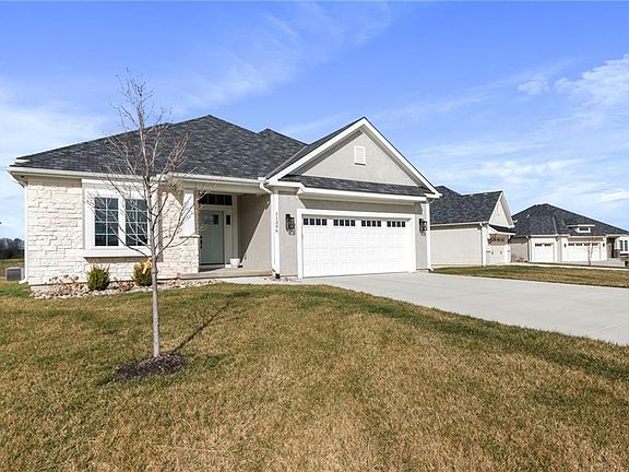 Like Brand New!!! Walk into the spacious foyer, tall ceilings and carefully selected, upgraded finishes, and feel instantly at home. Featuring main-level living, this 3-bedroom and 3-bath home offers upgraded quartz counters and backsplash in the kitchen, along with custom pull-out drawers in the cabinets and pantry. Enjoy stunning sunsets from the living room or from the screened-in deck while sitting next to the see-through fireplace. With the expert craftsmanship of builds by Bob Sanders, the quality of this home will not disappoint, as well as the upgraded large wet bar, equipped with a full-sized dishwasher and microwave, plus a bonus exercise room. HOA includes snow removal, lawn care, sprinkler system service, trails, and a new infinity swimming pool!! Located in Liberty School Districts with convenient access to I-35.