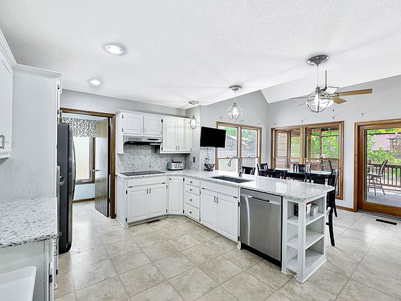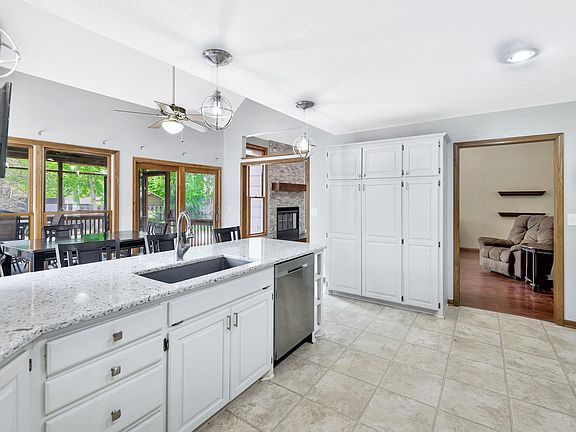 Step into this stunning home featuring soaring vaulted ceilings and an inviting entrance foyer that opens to a formal dining room, perfectly positioned with direct access to the kitchen—ideal for entertaining. The spacious master suite is located on the main floor and boasts a vaulted ceiling, a luxuriously updated master bath, and a serene retreat feel. The kitchen is a chef's dream, with quartz countertops, an eating bar, and a sunlit dining area surrounded by large windows. Enjoy the cozy ambiance of two fireplaces—the main one is a showstopper with stacked stone extending to the ceiling, while the basement fireplace offers a warm brick finish. Outdoor living is a breeze with a large, composite covered deck with screening, overlooking a fully fenced, private backyard—perfect for relaxing or entertaining. Inside, large windows throughout the home flood the space with natural light. The main floor laundry room adds everyday convenience. Upstairs, you’ll find a loft area and two generously sized bedrooms. The finished basement includes both a family room and rec room, complete with a wet bar and built-ins, offering plenty of space for gatherings and leisure. Modern updates, thoughtful design, and ample living space make this home truly exceptional.