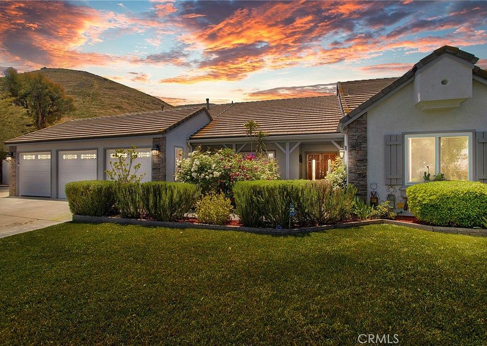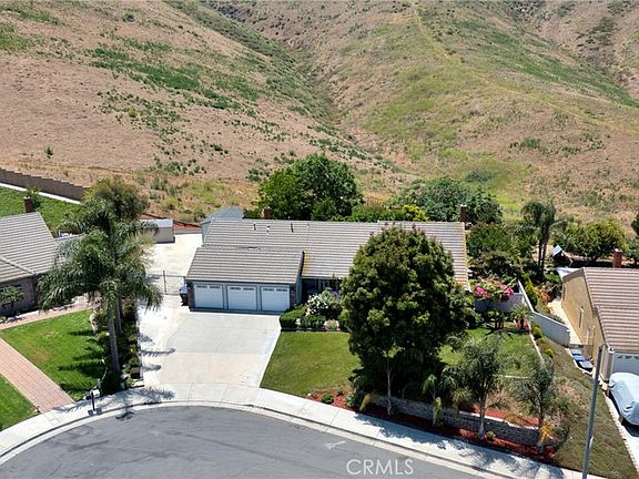 Welcome To This Highly Desirable Home in La Sierra Hills with Incredible Views. This home features 4-bed, 2.5-bath on the main level w/upstairs loft that sits in a serene sought after Cul-De-Sac. The double door entry leads you to high vaulted ceiling entry and through out, a living room with plenty of natural light with french doors to access the front porch, a formal dining room with sliding glass door. The kitchen has stainless steel appliances, granite countertops with a spacious island and open floorplan to an eat-in area and a family room with a fireplace. Open staircase leads to an upstairs loft. Split floor plan has 3 bedrooms and a full and a half bathroom, the primary bedroom on the opposite side has double door entry with a fireplace, sliding glass door, his and her closets and a roomy primary bathroom with vanity, double sinks, bathtub and walk in shower. Laundry room with a sink and cabinets. Laminate wood and tile flooring throughout. The beautifully landscaped backyard has a covered back patio with many fruit trees including, Mango, Tangerine, Persimmon, 2 orange, avocado, dark plum, red guava and a loquat tree. Beautiful romantic sunset views with access to horse and mountain 4+mile hiking trails. Three car attached garage and a large driveway that leads to a gated Rv parking for your RV, boat and outdoor toys. At the end of the driveway isa 200 sqft. storage room built with electricity and a cooling wall unit and a smaller storage shed. Solar panels on slate roof. This home shows pride of ownership with a lushess greenery curb appeal. Pictures don't do it justice. This is a must see home!!!