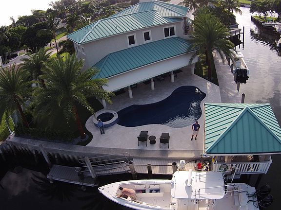 Impressive and rare point lot home w/water views from all rooms & 270' frontage just 1 lot from Intracoastal! Nautical perfection in this 3BR + loft home w/impact glass and SE exposure. Gorgeous Caribbean Rosewood floors throughout, soaring wood beam ceilings, fireplace, Phantom screens, elevator. Chef's kitchen w/tin ceiling, expansive island, Subzero, Thermador 6 burner range, warming drawer, 2 Miele dishwashers, 2 wine coolers, ice maker. Huge loft/game room has granite wet bar. Massive Master Bedroom/Bath w/private Waterfront balcony. Pool w/spa, Waterfront cabana w/sink & refrigerator. Dock has 20,000 lb lift, adjacent floating dock. No wake zone or fixed bridges!