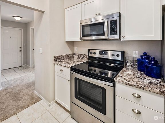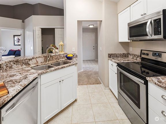 Great Location, Fantastic Price and Move-In Ready Condition! Top floor condo with vaulted ceilings, gas fireplace, in-unit washer/dryer and HUGE private deck/balcony. The kitchen boasts granite countertops, updated cabinets and stainless appliances. Granite bartop opens out into your spacious and light filled living and dining room combo. Your primary suite offers ensuite bathroom, with tub and a luxurious sized walk-in closet. The second bedroom lives like a second primary suite. The balcony looks out over onto a beautiful woodsy greenspace, a bird-watcher paradise! Garage space plus one uncovered space. So close to Boeing, Freeways, & shopping. Strong HOA, newer roofs and new hardi-siding in entire complex. Come check it out!