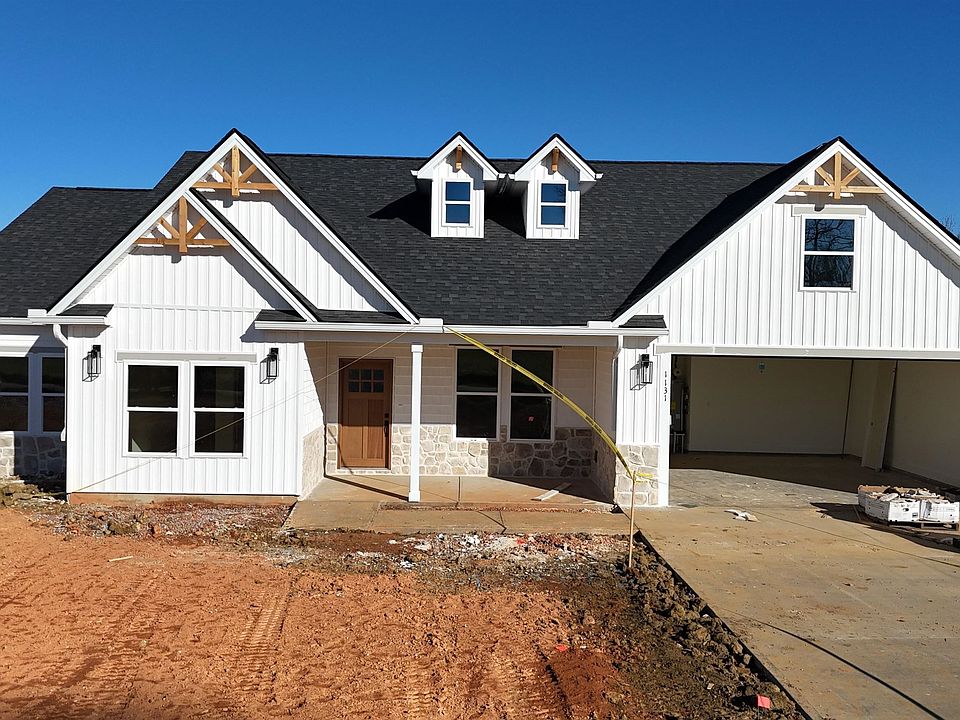 Modern Luxury on 2 Acres! This stunning new build offers over 2,260 sq. ft. all on one level, designed with comfort, light, and elegance in mind. Enjoy 10-foot ceilings, 8-foot doors, and floor-to-ceiling windows that fill the home with natural light. The oversized great room features a coffered ceiling and fireplace, opening to a beautiful kitchen with a custom coffee bar — perfect for entertaining or your morning routine. The owner’s suite is a true retreat, featuring a spa-inspired bathroom with a large all-glass walk-in shower, soaking tub, and a custom wood-shelved walk-in closet. The secondary bedrooms are spacious, and the home office boasts large windows for a bright, inspiring workspace. Step outside to the large covered back porch — a perfect spot to relax, watch the wildlife, and enjoy the peaceful surroundings of your 2-acre property. No HOAs! This home blends modern farmhouse style with luxury living in a serene, private setting.