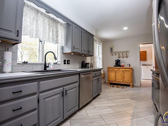 Nicely renovated walkout ranch in Seaman Schools. You will love the bamboo floors, updated baths, & new kitchen with large tile on the floors, granite countertops, & stainless steel appliances. Open finished basement offers great space & beautiful fireplace. Main floor laundry. Enjoy the outdoors on the covered front porch, the large deck or in the massive fenced-in backyard. Outbuilding offers great storage or room for projects. Newer roof, gutters, exterior paint & much more.