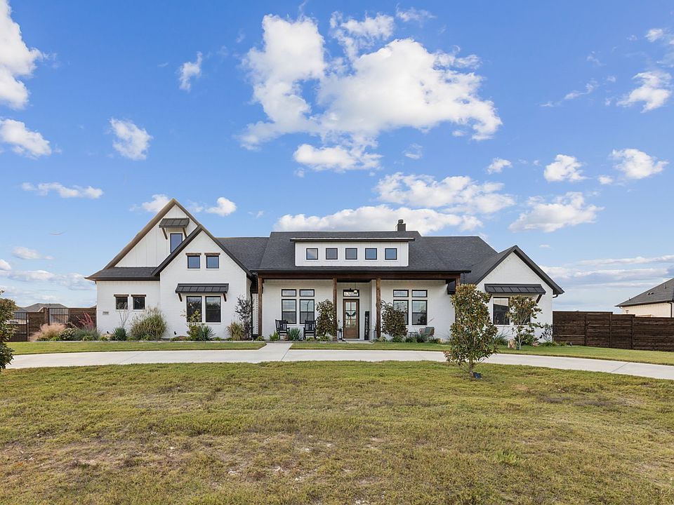 Exquisite modern farmhouse brimming with curb appeal and luxury finishes starting with a painted brick exterior & lush front yard landscaping on an acre lot & cul-de-sac street. Timeless architecture meets modern elegance with designer lighting, stunning fireplace, beamed ceilings, hardwood floors, privacy shades throughout, and large front porch. Host in the breathtaking kitchen boasting a 5-burner gas cooktop, double ovens, large island, under-cabinet lighting, quartz countertops & huge walk-in pantry. 5 bedrooms with walk-in closets, oversized 3 car garage, mud bench, large laundry room, circle driveway and auto gate. Owner’s suite with view of pool, free standing tub, granite countertops, and framed mirrors. Live and work from paradise in your home office with sliding barn door. Backyard oasis pool with large tanning ledge, large covered patio and fireplace. Extensive landscaping & paths lead you to the fully fenced yard with room for play.