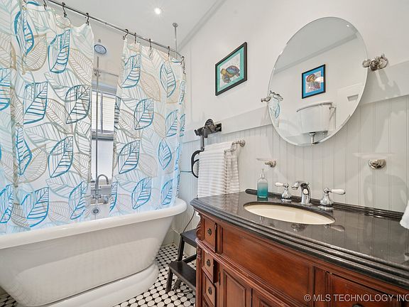 For the Tulsan looking for that very special niche, this 1925 Craftsmen Bungalow + apartment awaits. Main house: 3 bed/1.5 baths+ formal dining. Apartment: 1 bed/1 full bath/kitchen, living room, laundry, walk in closet, private patio. LOCATION: Tracy Park on the SW corner at 11th & Peoria is perched on the edge of Downtown Tulsa. With just 68 homes, this 1920’s Registered Historic Neighborhood is bordered to the north by Route 66 Highway (11th St), East is Peoria Ave (Market & Pearl St Districts), South is 15th St (Cherry St District & Maple Ridge Neighborhood), West is the Midland Valley Trail (leading to The Gathering Place) and the Cathedral District & Gunboat Park. Enjoy the tennis & pickleball courts, Tracy Park green space with trees, fountain and playground. Elementary School is highly desirable Council Oak. CONDITION: Apartment was gutted to studs and completely renovated 2024 from top to bottom: roof, kitchen, laundry, HVAC, flooring, windows, etc. Floorplan in pictures. Backyard was leveled, sodded and new sidewalk added in 2022. Also in 2022, the main house laundry room had a complete remodel and W&D stay with house. Main house had new roof in 2020, tankless hot water heater 2020, new dishwasher 2019, new garbage disposal 2021. The basement is fully usable for work area, storage, mancave and a new half bath completed Dec 2024. Period touches are throughout the house from the XL front porch, original stained glass windows, door hardware, free standing tub, windows, built in cabinets and more. The Historic Registered Neighborhood offers beautiful homes in many styles from the 1920’s & 1930’s, including a Bruce Goff home a few doors north of this one that has recently been meticulously restored. Goff is the architect of Boston Ave Methodist Church, within view of the Tracy Park neighborhood.