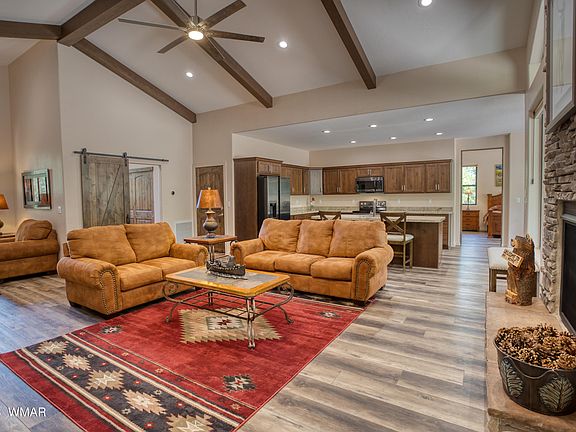 This beautiful custom 3 bedroom, 2 bath home offers an open floor plan, great room with a floor to ceiling stone fireplace, vaulted ceilings, custom cabinets, granite countertops, walk in closets, 8ft interior doors, and custom window coverings throughout. Most furniture conveys, an inventory list will be provided. The high-end finishes extend to the exterior with a metal roof, rain gutters and downspouts, expanded driveway and a fenced pet enclosure. There is a covered back patio with a ceiling fan, perfect for entertaining and enjoying the cool mountain air in the pines. Located in the gated community of Snow Creek which is a secluded area of Show Low. Snow Creek has maintained walking trails throughout and easy access to all the amenities that the town of Show Low has to offer.