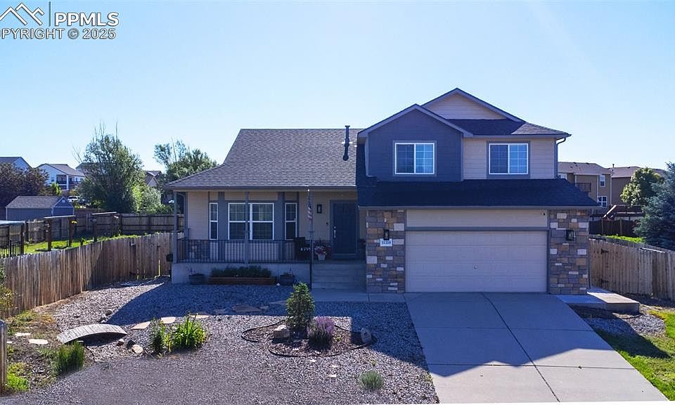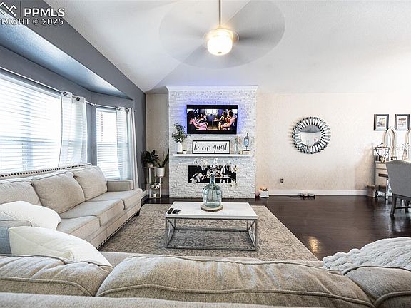 This charming 3-bedroom, 2.5-bathroom home offers breathtaking, unobstructed views of Pikes Peak right from the front porch. Inside, enjoy a cozy living room with an electric fireplace and a kitchen featuring brand-new quartz countertops, a spacious single-basin sink, and sleek stainless steel appliances. The lower level boasts a custom bar area, perfect for entertaining, while the sizable laundry room adds convenience to daily chores. The unfinished basement includes a bathroom that's already roughed in with a sink, toilet, and bathtub—just awaiting your finishing touches to complete the space. Outside, the fenced-in backyard includes a deck with a hot tub, designated RV parking, areas for raised garden beds, and a chicken run, catering to sustainable living enthusiasts.