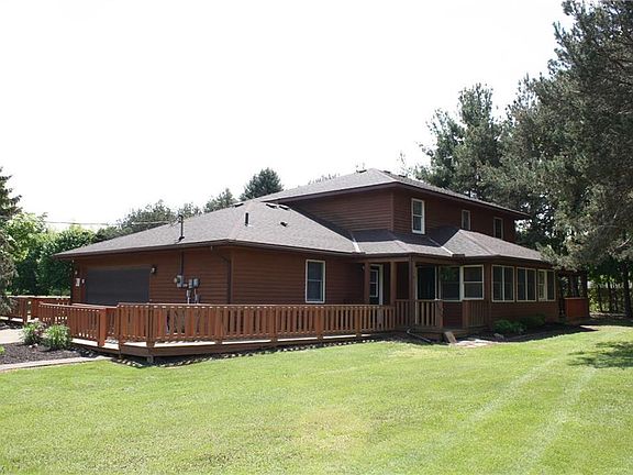 Enjoy the country life in this big, updated, cedar sided home sitting on over 5 acres. This home features a covered wrap-around porch, a remodeled open floor plan on the lower level with granite countertops, newer Schrock cabinets in the kitchen, laminate wood floors, water-proof vinyl click-lock flooring in the mudroom and laundry and a sunroom overlooking the back yard. New cabinets were also added to the laundry room for extra storage. The upstairs features a master bedroom which includes 2 closets and a full bathroom. There are 3 other bedrooms, 1 with newer carpet and a remodeled full bathroom. The 2 car attached garage is super clean with a new epoxy floor. The outside features an abundance of mature trees, a big pond in the front yard and a very deep back yard. To top things off this property also features a 40x60 barn with 2 overhead doors, extra storage with a loft and the back portion of the barn is insulated and heated for a great work space.