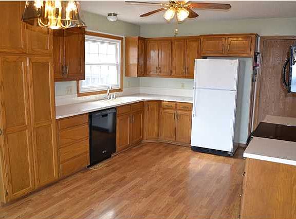 Very Sharp Ranch! Entryway with laminate floor and coat closet! Very large open lining room with wood and tile faced wood burning fireplace with gas starter, can lighting, laminate floor walkway, vaulted ceiling and ceiling fan! Bay window dining room with updated Pella patio doors and laminate floors! Super kitchen with lazy susan, large pantry, updated GE ceran top range with microwave above and a newer Kitchenaide dishwasher and laminate floor! Great master bedroom with two windows, two walk-in closets with sweater and shoe racks, ceiling fan and bath access! Sharp bath with large double vanity, tub/shower with tile surround and window! Two nice main floor extra bedrooms with window seats with storage below and closet with 3-way closet shelving! Nice size basement family room with a daylight window with wet bar rough-in! Basement bedroom with a daylight window and closet! Great deck off dining room over looking a fenced backyard with common area behind! Great storage building in the backyard! Newer items include roof, siding, guttering and upgraded windows!
