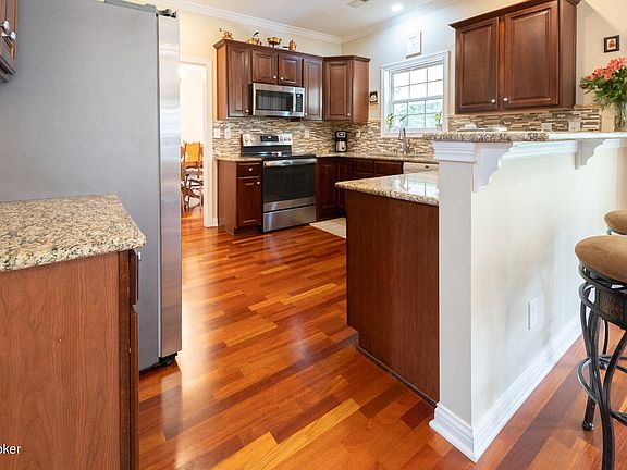 The heart of this home is undoubtedly the large eat-in kitchen, featuring upgraded cherry raised panel cabinets, recessed lighting, and a suite of modern appliances, including a stainless steel flat-top stove, dishwasher, over-the-range microwave, and refrigerator. Enjoy Granite countertops, an abundance of cabinets, and open to the enormous Great room. The breakfast bar offers a casual dining option and overlooks the well-lit Great room. This cozy space is highlighted by a wood-burning fireplace, built-in bookcases, and surround sound, making it ideal for relaxation and family time.