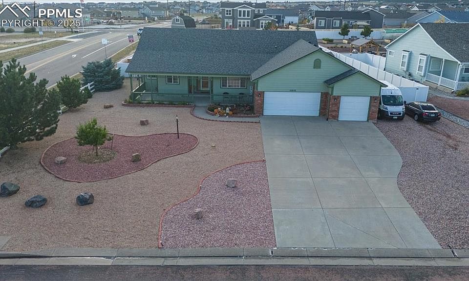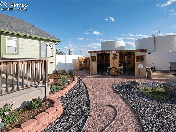 Discover the spacious elegance of this stunning 5-bedroom, 3-bathroom home, ideally located in the rapidly growing community of Peyton, CO. Offering NO HOA!, this property is perfect for those seeking both room to grow. Situated on a generous corner lot (.54 acres), it provides ample space for RV parking, gardening, or hosting gatherings in your expansive backyard. The private outdoor retreat features a firepit, custom BBQ shed, and a large patio, ideal for entertaining or relaxing. Low-maintenance landscaping allows you more time to enjoy your space rather than tending to it. With convenient access to local amenities, schools, and major highways, your commute is a breeze. Step inside to a welcoming open-concept floor plan that seamlessly blends function and style. The spacious living room, complete with vaulted ceilings, creates a bright, airy atmosphere. The large kitchen boasts sleek granite countertops, ample cabinetry, and a large bar area for additional seating. The dining area flows effortlessly from the kitchen, making it the perfect setting for family meals or entertaining. Adjacent to the entry, a versatile bonus room awaits, ideal for a second living space, formal dining, or home office. The master suite serves as a private sanctuary, offering a walk-in closet and a luxurious en-suite bathroom with dual vanities, a jetted soaking tub, and a separate shower. A spacious additional room off the master could serve as an office, workout space, or quiet reading nook. Two additional generously sized bedrooms share a second full bathroom, providing comfort for family or guests. The expansive 4-car tandem garage features built-in cabinets, perfect for a workshop or extra storage. Downstairs, the massive basement offers a family room with a bar area and sink, two large bedrooms, and a third full bathroom. This home provides an exceptional blend of space, style, and convenience—schedule your private showing today and make it yours!