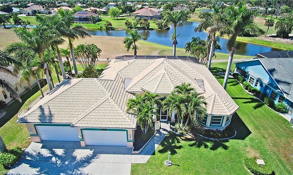 FABULOUS SUNSET VIEWS FROM THIS CUSTOM BUILT, PRISTINE CONDITION, GOLF COURSE POOL HOME! Custom Home located within the gated 27 hole golf community of Cape Royal. This spacious, bright, meticulously maintained, custom built home has 3 bedrooms, study, 3 full bath, MASSIVE 4 car garage. The home enjoys views of the golf course & a lake and of course Beautiful Sunsets. The split floor plan provides a master suite with two walk in custom closets opening to a master bathroom with jacuzzi tub, walk in shower, & dual sinks. The large under truss lanai will be great for outdoor Entertainment and leads to an enclosed pool area. The home sits on an oversized professionally landscaped lot with a beautiful lake view. It also has an automated zone sprinkler system. Cape Royal is a gated, financially strong community, Pine Island public water & it's location in Lee County(not Cape Coral) means lower taxes and water fees. Enjoy both virtual tours. Oh one more thing, THIS IS FLORIDA LIVING AT IT'S FINEST!