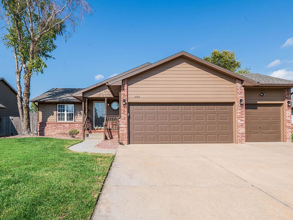 Welcome home! This stunning 3-bedroom, 3-bath property offers the perfect blend of comfort, style, and functionality. With new siding and 3-car garage which is a rare find in this neighborhood, this home is move-in ready and built for modern living. Step inside to find an inviting open floor plan with spacious living areas, abundant natural light, and neutral finishes that suit any décor. The kitchen provides ample counter space and storage, ideal for everyday meals or entertaining guests. Experience entertainment like never before with wired surround sound throughout the whole home! The primary suite features a private ensuite bath and generous closet space, offering a peaceful retreat at the end of the day. Two additional bedrooms and bathrooms ensure plenty of room for family or guests. Outside, enjoy the newly refreshed exterior with brand-new siding—offering both curb appeal and low-maintenance living. This house includes a large patio out back which is great for entertaining and a fenced in yard for added privacy. The 3-car garage provides extra storage and workspace for vehicles, tools, or hobbies and includes a build in kennel. Located in the Goddard School District, this home gives you access to some of the area’s best schools, parks, and community amenities—all just minutes from shopping, dining, and major highways.