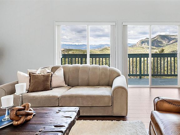 Discover breathtaking views from this beautifully upgraded home poised on a prime 2.2-acre lot in the heart of Conifer. Enter into a freshly painted interior drenched in natural light from large picture windows w/ Hunter Douglas blinds and automated energy-efficient cellar shades in the living area. Vaulted ceilings draw eyes upward in the living area grounded by a fireplace. Freshly remodeled, the kitchen boasts upgraded flooring, custom cabinetry and stainless steel appliances. Three generously sized bedrooms include a primary suite featuring a large walk-in closet and a cozy wood-burning stove. The baths have been completely remodeled, showcasing porcelain tile flooring, custom floating cabinetry, illuminated vanity mirrors and premium Kohler fixtures. Retreat outdoors to a vast deck to admire sprawling views, spanning from Mt. Evans to Lion's Head and Mt. Bierstadt. Upgrades include a newer roof + water heater, updated plumbing + electrical, newly painted exterior, radon system, Nest security system, security and landscape lighting. New Daikin ductless mini-split heating and cooling units are included, significantly reducing utility costs. Seller has architectural plans, ILC, quote, and approval from Jefferson County for a garage to be built, if desired.