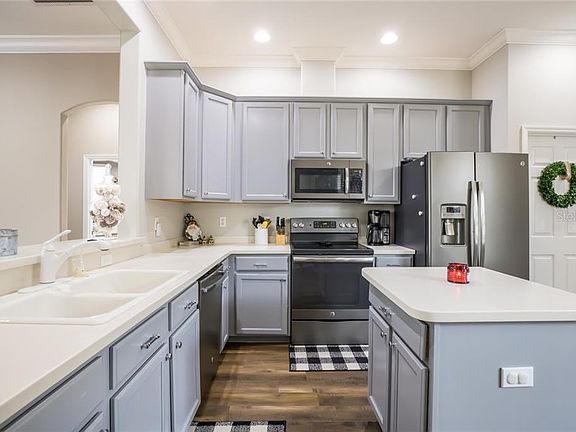 - Eating Space In Kitchen, Master Bedroom Downstairs, Split Bedroom, Walk-In Closet(s), Crown Molding, Solid Wood Cabinets, Solid Surface Counters, Window Treatments
